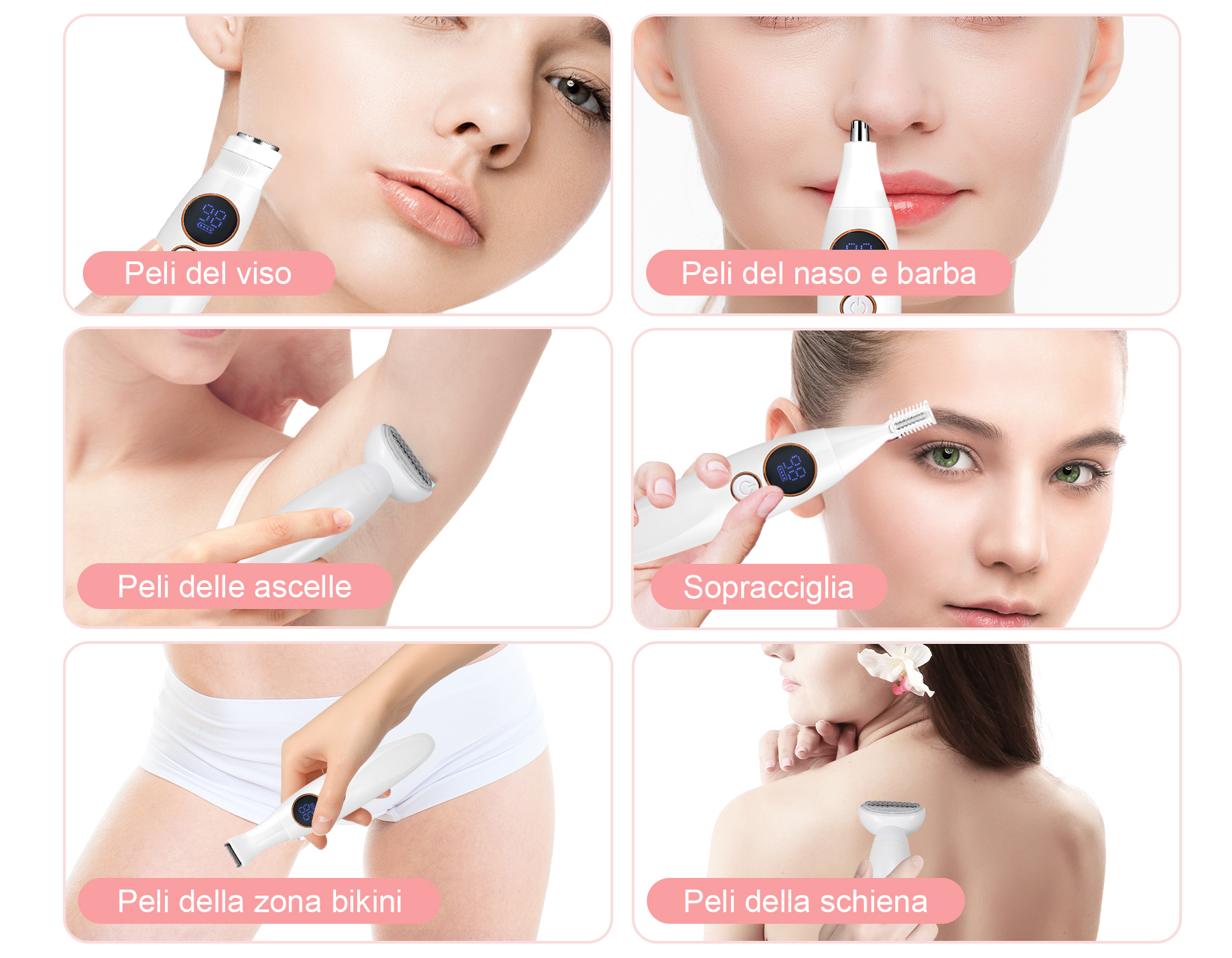 - Versatilità tutto in uno: Cinque testine intercambiabili gestiscono tutte le tue esigenze di depilazione.