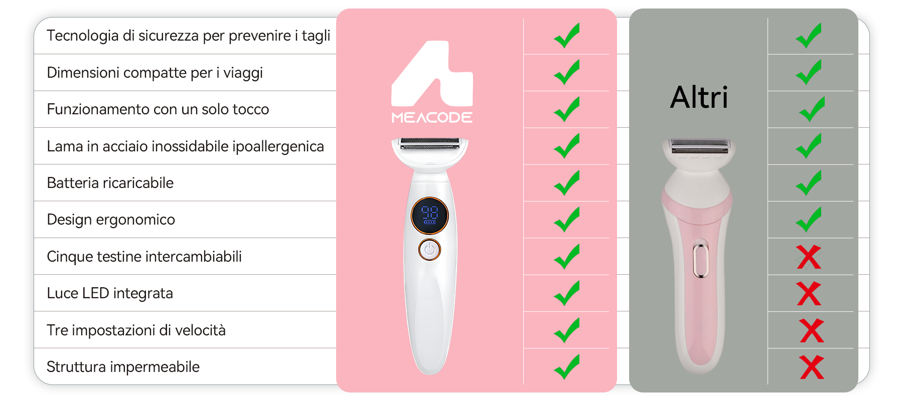 Meacode crede che la tecnologia debba dare potere, non complicare. Ecco perché ogni caratteristica - tecnologia anti-taglio brevettata, versatilità tutto in uno, design ergonomico - è stata creata per te. È più di un rifinitore; è il tuo restauratore di fiducia, che ti aiuta a riconquistare la libertà e a sentirti pronta per qualsiasi cosa.
