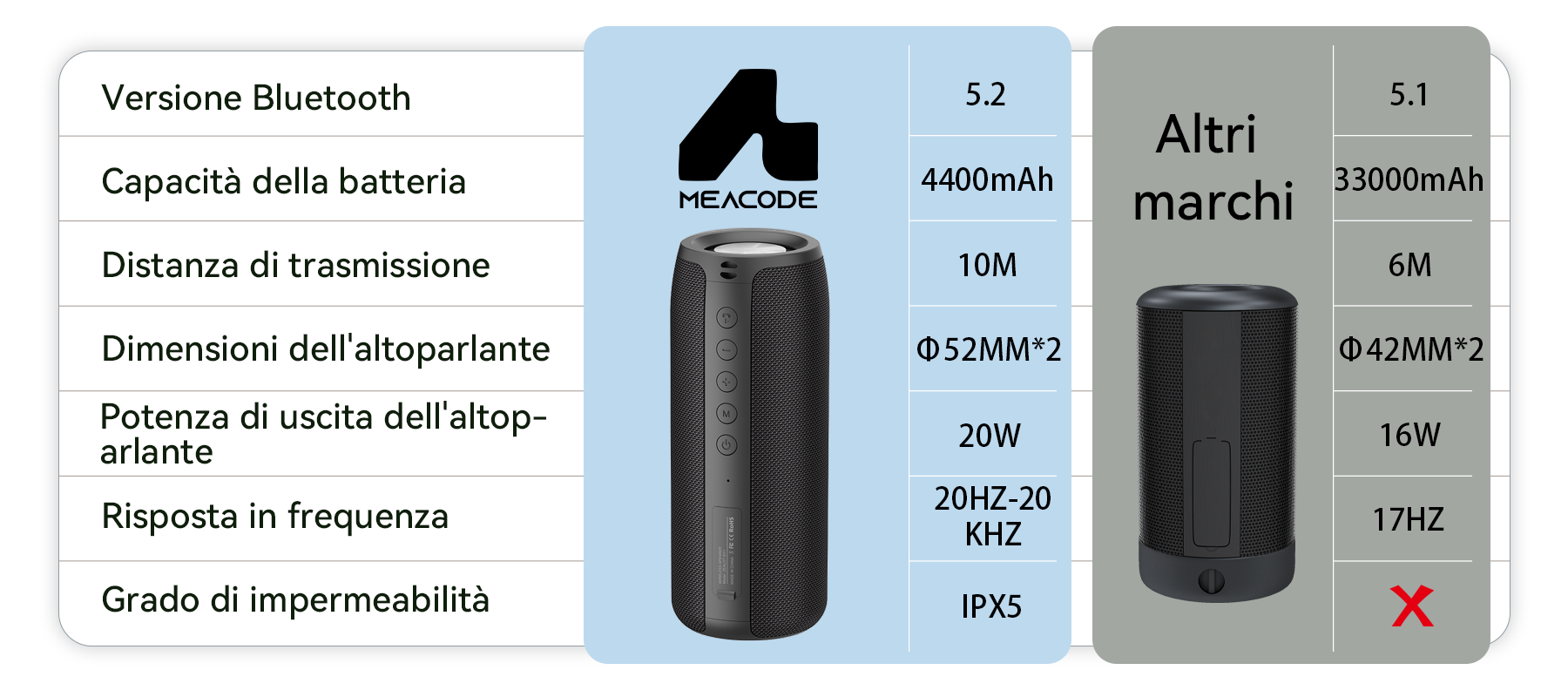 Il diffusore Bluetooth Meacode utilizza un avanzato chip a basso consumo energetico e una tecnologia della batteria al litio ad alta densità. È il tuo "compagno di resistenza" più affidabile durante lunghi viaggi, avventure all'aria aperta o sessioni di visione intensiva, mantenendo la tua musica, i tuoi video o i tuoi giochi sempre attivi. Elimina l'ansia da batteria e abbraccia la libertà.