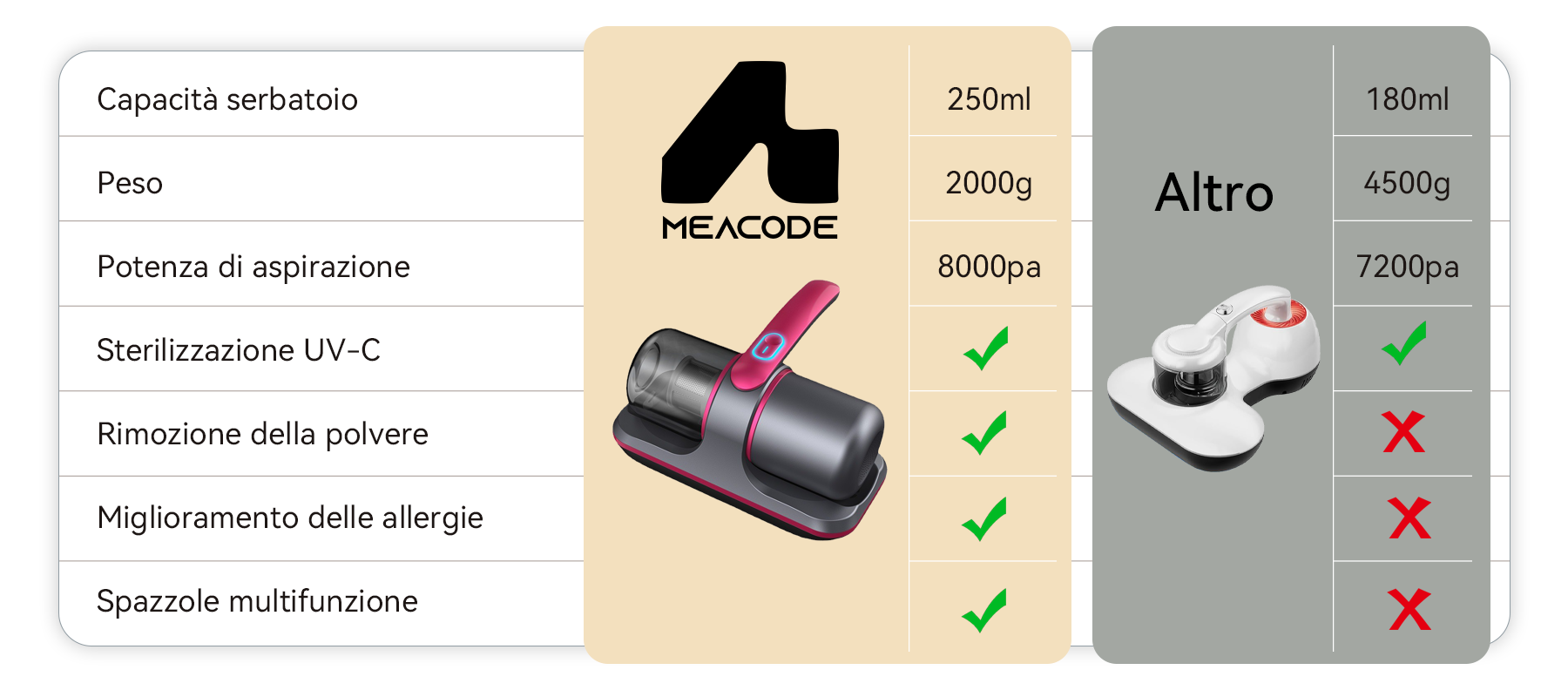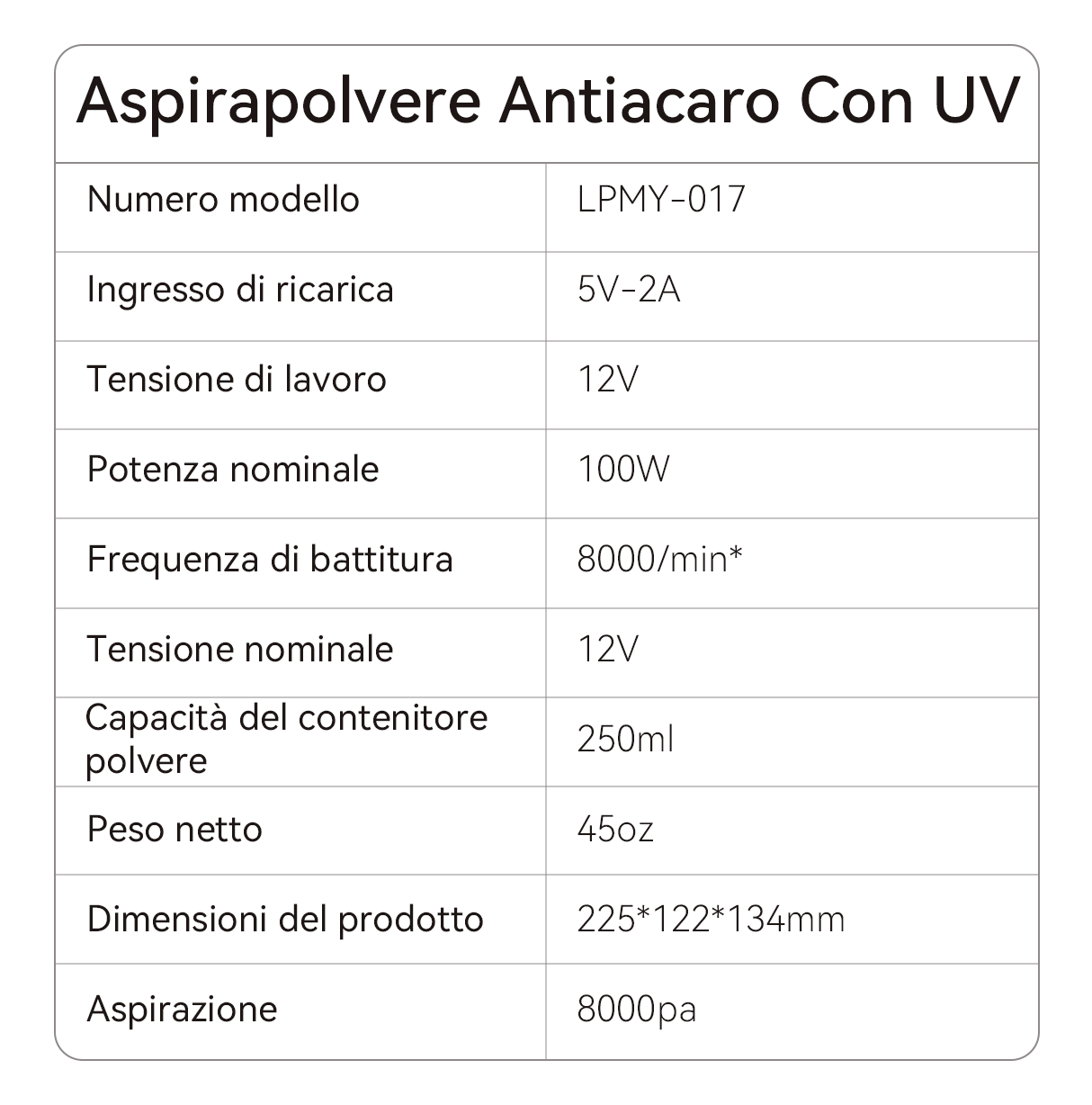 - Tecnologia a vibrazione ad alta frequenza - 8.000 colpi al minuto per smuovere con forza gli acari più ostinati.